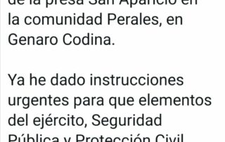 Lucía Medina Zacatecas.- Ante el desbordamiento de la presa San Aparicio en la comunidad Los Perales, en el municipio de Genaro Codina, se implementó el Plan DNIII-E por parte de la Secretaría de la Defensa Nacional y Guardia Nacional. Así lo informó David Monreal Ávila en su cuenta de